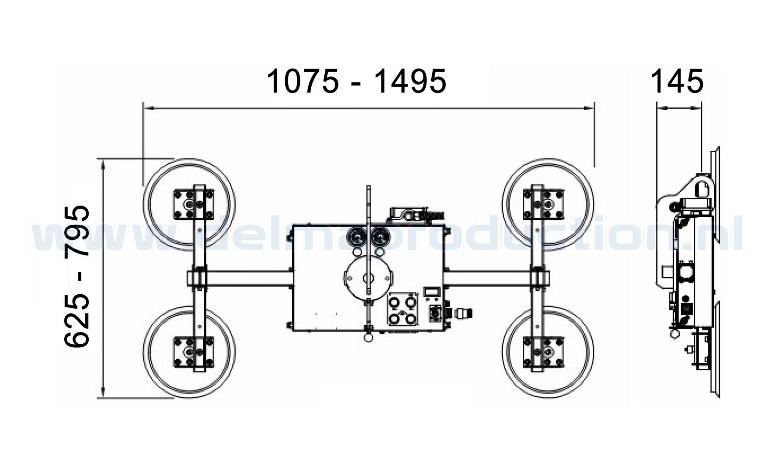 - Vier grote zuignappen met een diameter van 300 mm. Deze zijn zowel in hoogte als in breedte verstelbaar.